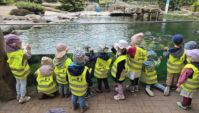 Diesen Weg nahmen diese Woche die Kletterwürmer und Rasselbande auf sich, Im Zoo gab es wie immer viel zu entdecken und lernen. Am Polarium begrüßten uns die Pinguine und Wildgänse. An der Verglasung bestaunten die Kinder besonders die Schwimmkünste der Pinguine. Im Polarium zeigten uns dann auch die Eisbären wie toll sie schwimmen können. Gemeinsam versuchten wir so weit wie ein Eisbär zu springen. Leider schafften wir es alle nur bis zum Eichhörnchen. Besonders schön fanden die Rasselbande Kinder die Quallen im Aquarium. Wir hatten sogar glück und durften beim Füttern der verschiedene Fische Live dabei sein. Auch gefährliche Tiere wie Löwen und Krokodile gab es zu bestaunen.