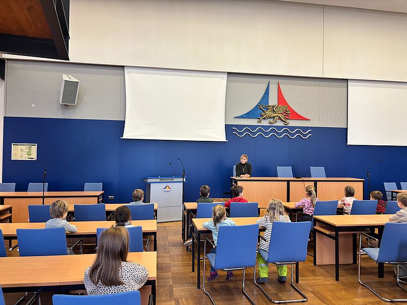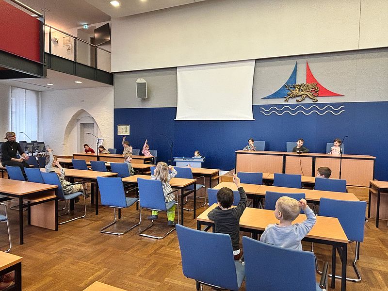 Im Ratssaal wurde kindgerecht erklärt, welche Aufgaben dort erfüllt werden. Anschließend spielten die Kinder selbst eine Ratssitzung nach – mit Bürgermeisterin, Präsident, Abgeordneten und weiteren Rollen. Höhepunkt war die Abstimmung über die Frage: „Soll am Freitag der Fischtag in der Kita bleiben?“ Mit 8 zu 7 Stimmen entschieden sich die Kinder für den Fischtag.