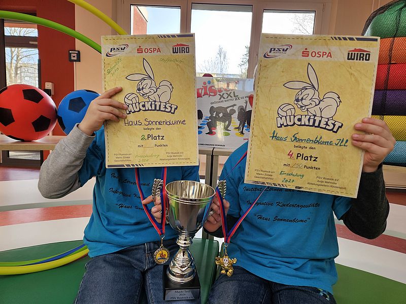 Auch in diesem Jahr haben wieder Kinder aus unserer Einrichtung erfolgreich am Muckitest teilgenommen. Im Vorfeld wurde aus allen Kindergartengruppen gewählt, wer daran Spaß hat sein Können bei dieser riesigen sportlichen Veranstaltung vom PSV unter Beweis zu stellen.Es wurde fleißig zu Hause und in der Kita geübt und motiviert starteten die Kinder zum Wettbewerb. Sie zeigten bei den unterschiedlichen Disziplinen und beim Staffellauf was sie drauf haben. Der Teamgeist war spürbar und als am Ende die Ergebnisse verkündet wurden, konnten die Kinder ihr Glück kaum fassen. Die Sportler vom Team Einschulung 2026 durften sich über den 2.Platz freuen und errannten sich auch den 2.Platz beim Staffellauf. Das Team Einschulung 2027 erreichte den 4.Platz. Wir sind mega stolz und freuen uns schon jetzt auf das nächste Jahr.