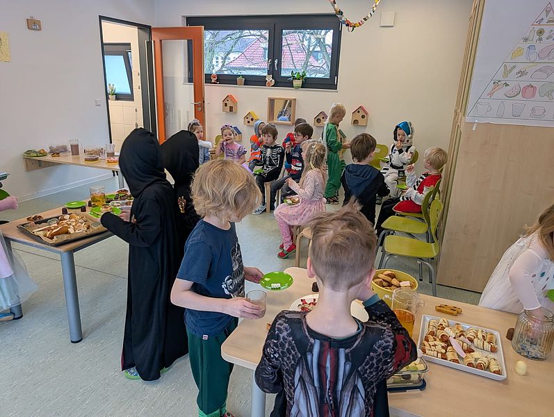 Und die Großen? "Schlaufüchse", "Wühlmäuse" und "Knallerbsen" feierten in den Gruppenräumen mit unterschiedlichen Angeboten. Auch hier fand das leckere Buffet einen großen Anklang. Daneben gab einen Party-Raum mit Disco und einen Raum für einerseits Wurfspiele, andererseits das Geschicklichkeitsspiel "Heißer Draht", nur mit Pappe und Konfetti. Mit einer langen Polonäse haben wir sogar die Krippe besucht.