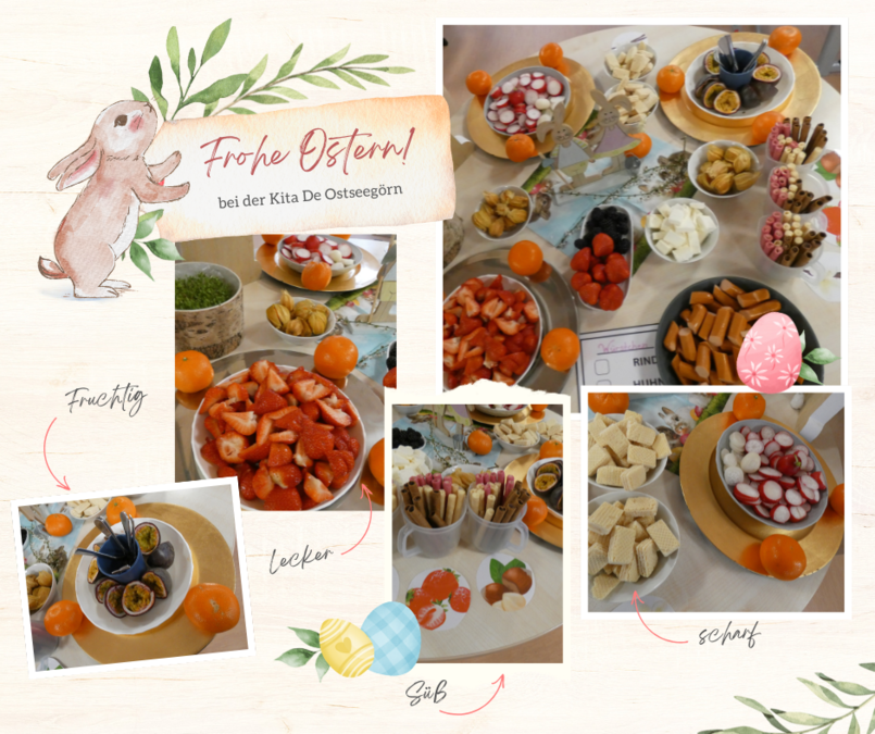 Heute war es so weit. Unser Kita-Tag stand ganz im Zeichen des Osterhasen. Um überhaupt gut in den Morgen zu starten, haben wir uns ein leckeres Osterfrühstück schmecken lassen. Da auch der Osterhase nicht nur Eier und Schokolade mümmelt, wollten wir dem ebenso gerecht werden. Auf dem Tisch fanden sich süße/fruchtige Leckereien wie Erdbeeren und Brombeeren. Dazu weitere Besonderheiten wie rot/weiße Radieschen und vitaminreiche Physalis. Außergewöhnliche Sachen wie Passionsfrüchte zum Löffeln und Oba-Käse 'Krem-Peynir' fanden auch Platz auf der reich gedeckten Tafel. Satt und voller Energie haben wir uns angezogen und auf dem Hof versammelt, um mit unserem eigenen Oster-Song "Was macht der Osterhas'?" den fleißigen Hasen anzulocken. Mit Erfolg? Aber logo! Denn irgendwie haben sich kleine Schokohasen draußen versteckt und wollten unbedingt gefunden werden. Da haben die Kinderaugen aber geleuchtet. Wir schicken ein lautes und fröhliches "Dankeschön" über die Wiese und hoffen, dass der Osterhase uns hören konnte.