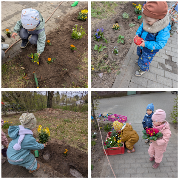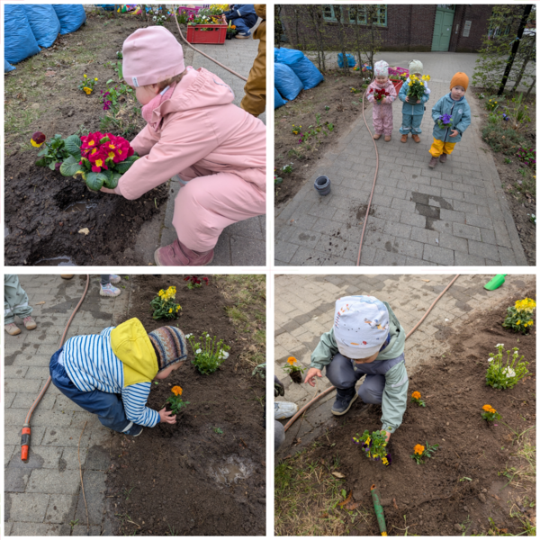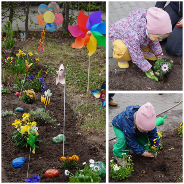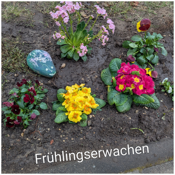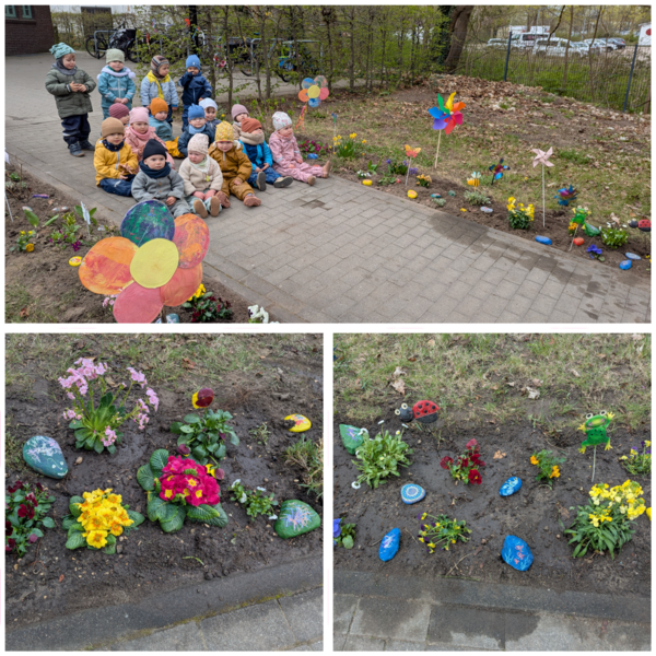 Beim Frühlingserwachen in der Kita wurde alles liebevoll und frühlingshaft gestaltet. Gemeinsam haben die Kinder die Beete mit bunten Blumen bepflanzt und anschließend mit kleinen Windmühlen sowie bemalten Steinen dekoriert. Überall war die Freude am Gestalten und Entdecken zu spüren. Zum Abschluss wurden gemeinsam fröhliche Frühlingslieder gesungen.