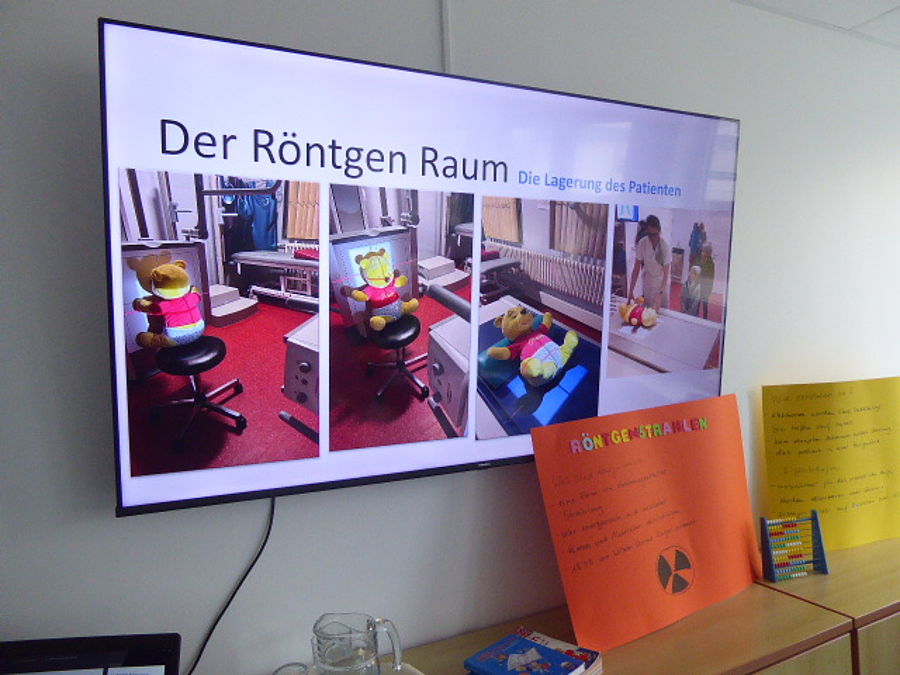 Zu Beginn fragte Frau Rudnikowski die Kinder, wer weiß was „Röntgen“ bedeutet und ob sie selbst schon einmal geröntgt wurden. Sie erklärte kindgerecht, was Röntgenstrahlen z.B. im Vergleich zu Sonnenstrahlen sind. Die Kinder hörten aufmerksam zu und staunten darüber, dass man mit Hilfe von Röntgenbildern in den menschlichen Körper „hineinschauen“ kann, ohne ihn zu öffnen. Als Beispielpatient diente der Teddy „Winnie Pooh“, welcher im Voraus im Krankenhaus „geröntgt“ wurde und in einer Präsentation für die Kinder bildlich dargestellt wurde.