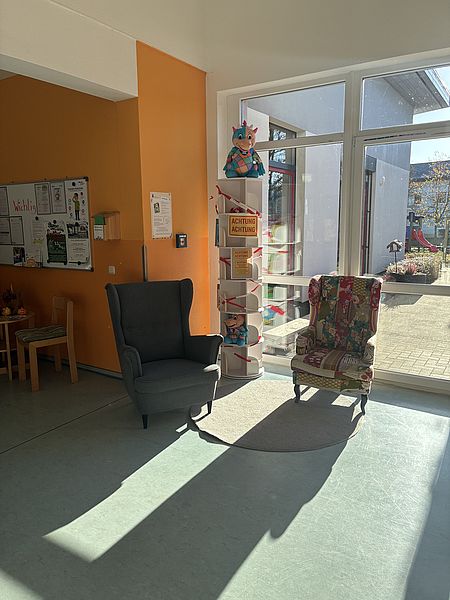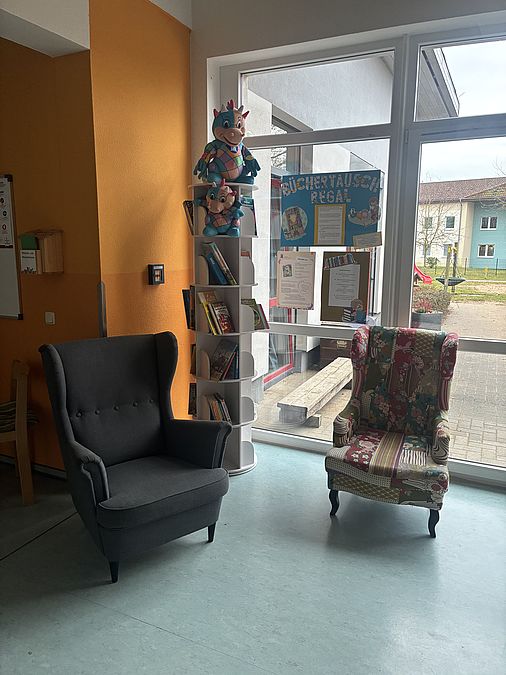Das Regal lädt zumSstöbern, Verweilen und Austauschen ein und ergänzt unsere gemütliche Leseecke, die Raum für Ruhe, Fantasie und gemeinsame Lesezeit bietet.