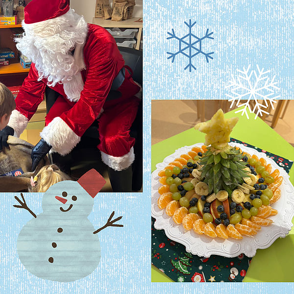 Nach einem gemeinsamen Frühstück , bei dem alle Eltern leckere Speisen mitgebracht haben , kam endlich der Weihnachtsmann zu Besuch . Das war natürlich das absolute Highlight, dieser sorgte für große Augen und viel Freude. Er nahm sich Zeit für die Kinder und brachte liebevoll ausgewählte Geschenke mit, über die sich alle sehr gerfreut haben.