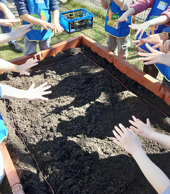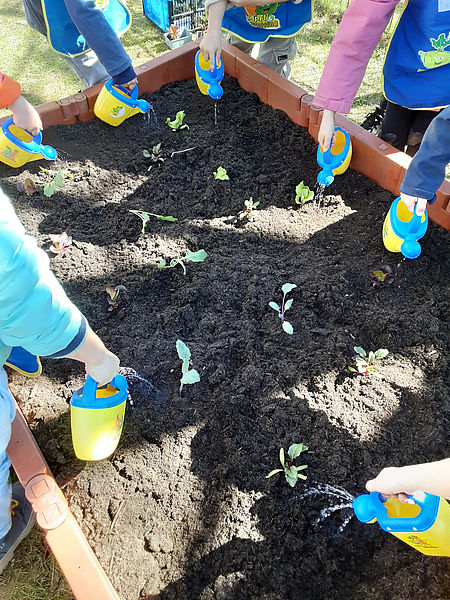 Gemeinsam mit der Stiftung Edeka pflanzten unsere Kinder im April verschiedene Gemüsesorten und Kräuter an. Dabei säen, gießen und pflegen sie die Pflanzen selbst und erleben, wie diese wachsen und geerntet werden. Diese praktischen Erfahrungen fördern nicht nur die motorischen Fähigkeiten, sondern auch das Verantwortungsbewusstsein, die Geduld der Kinder und das Gemeinschaftsgefühl wird gestärkt. Die Auswahl der Pflanzen erfolgt kindgerecht. So lernen sie spielerisch, wo Lebensmittel herkommen und was Pflanzen zum Wachsen brauchen.