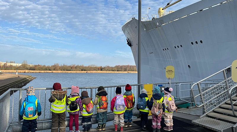 Gitarrenhüpfer, Klaviermäuse und Kletterwürmer besuchen das Traditionsschiff im Rahmen ihres Projektes: "Rostock - Mythen und Sagen"