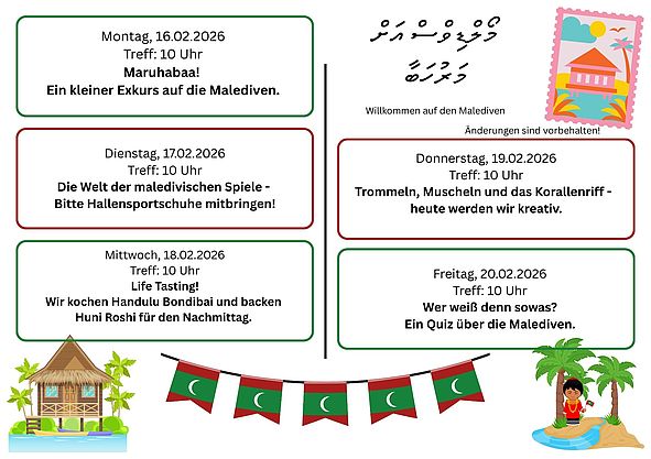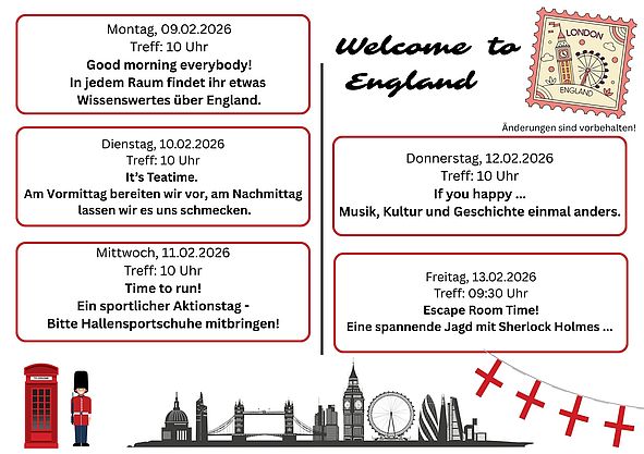 Wie im jeden Jahr finden in den Winterferien bei uns im Hort die Länderwochen statt. Dieses Jahr reisen wir mit euch nach England und auf die Malediven. Seid gespannt und schaut auf unseren Ferienplan, was wir für euch geplant haben.