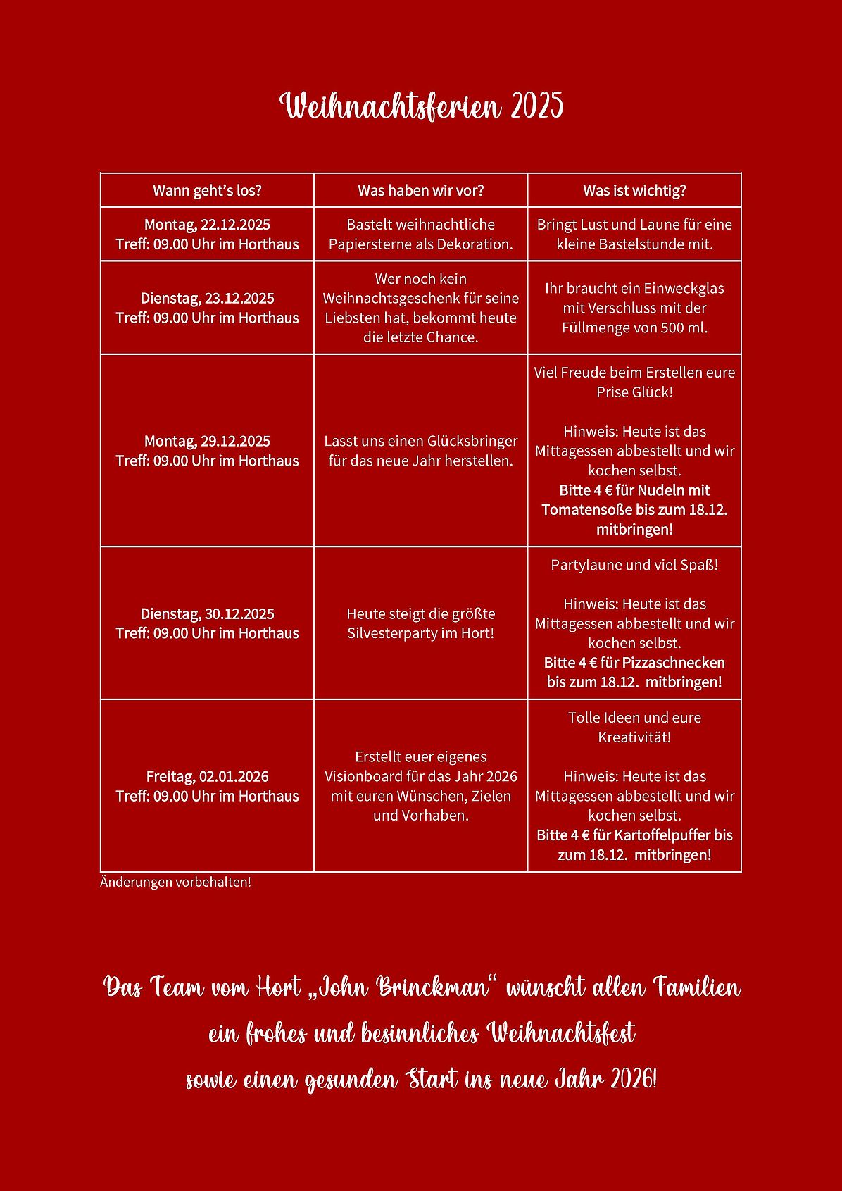 Wichtig: Für den 29.12. und 30.12.2025 sowie für deen 02.01.2026 ist das Mittagessen abbestellt. An diesem Tag kochen wir bei uns im Hort leckere Gerichte. Bringt für diese Kochangebote bitte jeweils 4 € bis zum 18.12. mit! Wer bis zu diesem Zeitpunkt das Geld nicht abgibt, bringt an den besagten Tagen bitte ein Lunchpaket mit. Liebe Eltern, bestellen Sie bitte auch das Mittagessen ab für die Tage, an denen Ihr Kind nicht den Hort besucht. Vielen Dank!