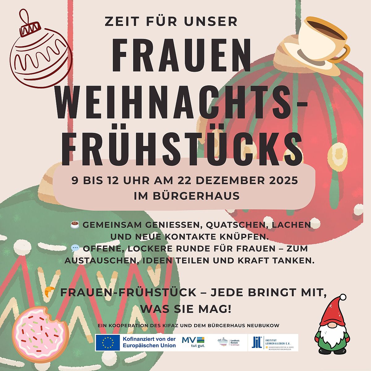Am 22. Dezember 2025 von 9 bis 12 Uhr laden wir alle Frauen herzlich zu einem gemütlichen Weihnachts-Frühstück ins Bürgerhaus Neubukow ein.
