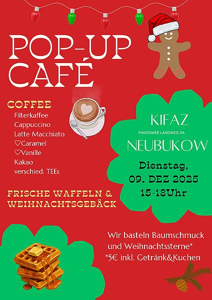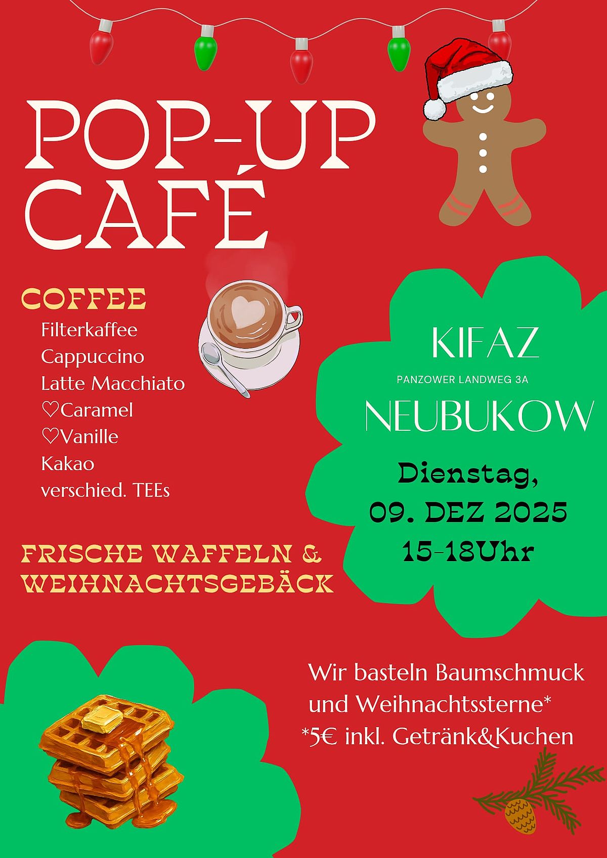 Am Dienstag, den 09. Dezember 2025, öffnet unser gemütliches Pop-Up Café von 15:00 bis 18:00 Uhr seine Türen im KiFaZ, Panzower Landweg 3a.