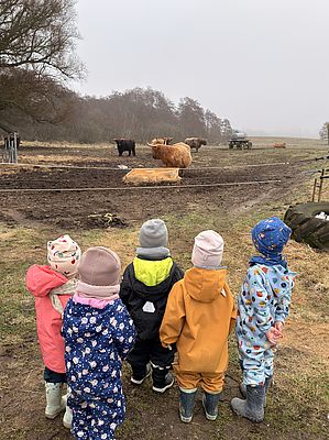 Die Kinder durften die Tiere aus sicherer Entfernung beobachten, ihre Geräusche nachahmen und voller Begeisterung die Unterschiede zwischen den Kühen entdecken. Zwischendurch wurden Blätter, Blumen und kleine Käfer genau unter die Lupe genommen – jeder Schritt war ein kleines Abenteuer!