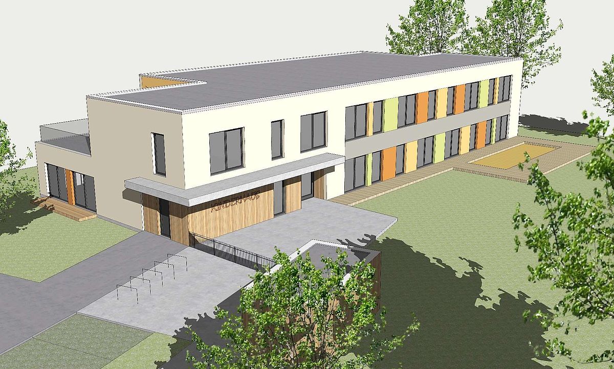 In dem zweigeschossigen Neubau betreuen wir künftig bis zu 86 Kinder:
