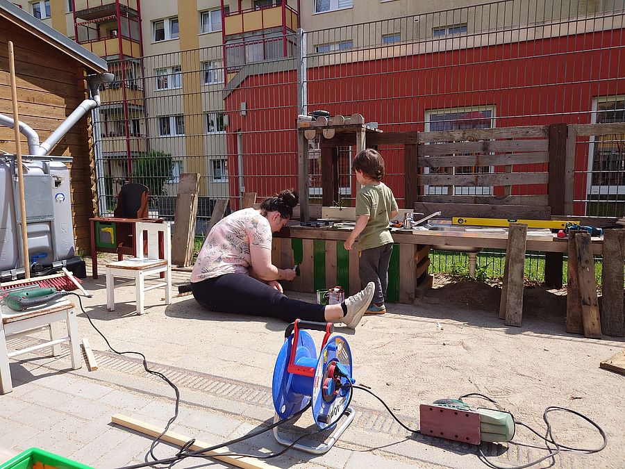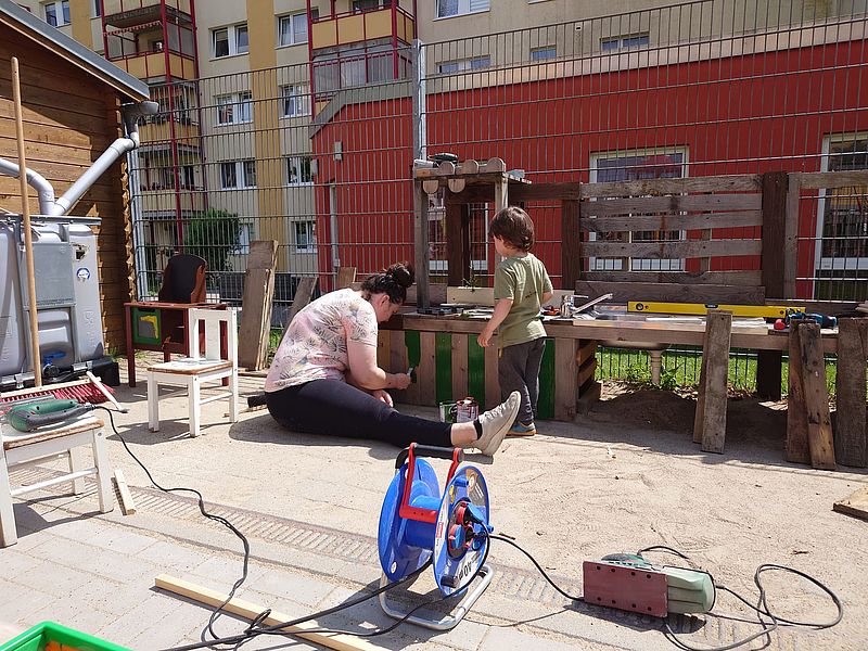 Kurz vor den Sommerferien hat sich die Rasselbande an einem Samstag auf dem Gelände der Kita eingefunden. Zusammen wollen wir das Außengelände unserer Kita auf vordermann bringen. Jeder packt mit an und verteilt sich auf dem Hof. Einige Eltern tauschen kaputte Bretter aus, andere lackieren die Matschküche, damit sie wieder in neuem Glanz erstrahlen kann. Selbst einige Kinder sind gekommen und packen kräftig mit an und sorgen für gute Stimmung. Zur Mittagszeit stärken wir uns mit Hotdogs und verschiedenen Salaten. Bis zum frühen Nachmittag dauerten unsere Renovierungsarbeiten. Das Ergebnis kann sich sehen lassen. Unsere Küche erstrahlt in neuem Glanz und auch das kleine Versteck in der Hecke ist wieder fest mit dem Zaun verbunden. Auch der Sand auf dem Außengelände ist wieder da wo er hingehört. Wir bedanken uns bei der kräftigen Unterstützung.