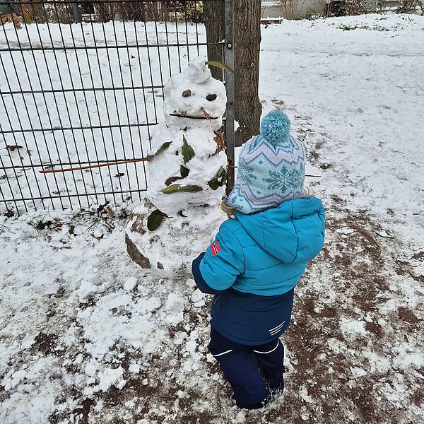 Dieser Montag wurde uns mit Schnee versüßt. Alle Kinder erzählten sofort vom schönen Schneegestöber draußen, als sie in die Kita kamen. Die meisten wurden bereits mit Schlitten gebracht und freuten sich später im Schnee zu spielen. Für die Erzieher war alles klar. Nach dem Frühstück haben wir uns schnell angezogen und sind in die klirrende Kälte gegangen. Hier haben wir den Kindern gezeigt wie man einen Schneemann baut. Zusammen rollten wir 3 große Kugeln und setzten sie zusammen. Noch ein paar Steine und Stöcker und fertig war der Schneemann.