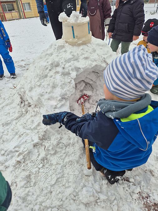 John schippte in der Zeit den Schnee vom Sportplatz zusammen auf einen Haufen. Diesen nutzten unsere Jungs gleich und versuchten mit Schippen und Eimern ein Iglo zu bauen. Am Ende wurde es ein Schneetunnel und die Jungs waren sehr zufrieden mit ihrem Werk. Und was darf bei Schnee auch nicht fehlen? Na klar! Eine Schneeballschlacht! Schnell wurden Kugeln geformt oder einfach nur Schnee in die Hand genommen und los gehts. Auch die Erzieher wurden nicht verschont. Am Ende waren wir alle etwas nass und kalt aber sehr glücklich. Hoffentlich fällt bald noch mehr Schnee!