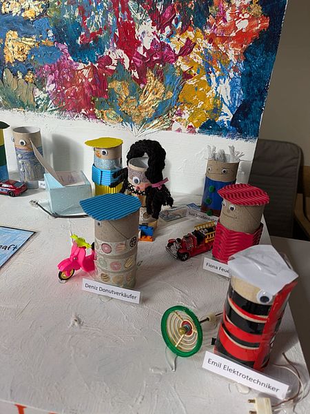 Bilder zum Theaterstück ,, Bei der Feuerwehr wird der Kaffee kalt'' - gemalt von M. und L. (5 Jahre)