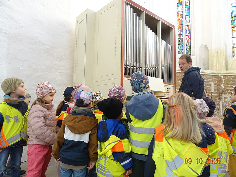 Besucht wurde die Petrikirche: Die Kirche wurde von innen betrachtet, die Architektur und den Raum erkundet. Ein Orgelspiel haben wir ebenfalls angehört und dabei die Klangfarben wahrgenommen. Ein weiteres Highlight war der Aufstieg zum Turm – mit dem Fahrstuhl ging es hinauf, und von oben bot sich ein beeindruckender Blick über Rostock. Die Ferne und die Nähe der Dächer, Türme und Straßen gaben Impulse für eigene kreative Interpretationen.
