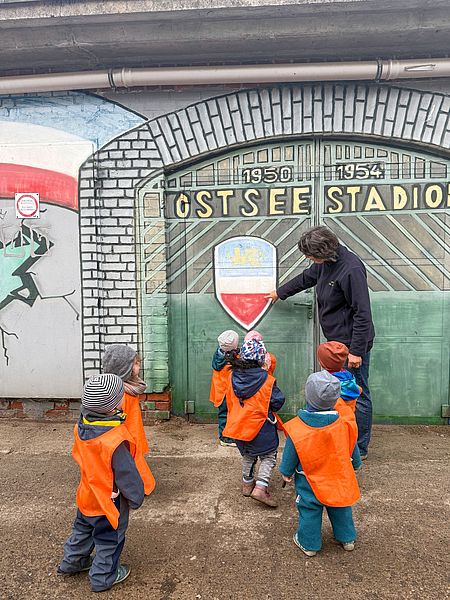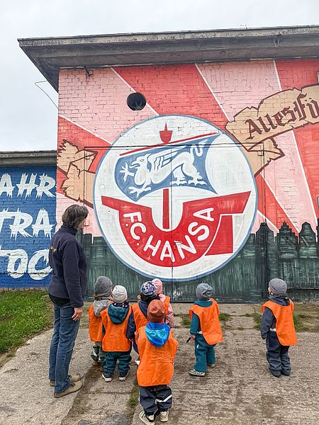 Den Auftakt bildete eine gründliche Beobachtung der Hansa-Stadtgeschichte am Ostseestadion, dessen Fassade und Atmosphäre die Kinder neugierig machten.
