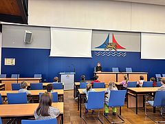 Die Kinder besuchten das Rostocker Rathaus. Dort erhielten die Kinder eine spannende Führung und erfuhren viel über die Geschichte des Gebäudes. Besonders interessiert schauten sie sich das Modell der Stadt Rostock sowie den Rostocker Greif an. Im Ratssaal wurde kindgerecht erklärt, welche Aufgaben dort erfüllt werden. Anschließend spielten die Kinder selbst eine Ratssitzung nach – mit Bürgermeisterin, Präsident, Abgeordneten und weiteren Rollen. Höhepunkt war die Abstimmung über die Frage: „Soll am Freitag der Fischtag in der Kita bleiben?“ Mit 8 zu 7 Stimmen entschieden sich die Kinder für den Fischtag. Weiter ging es auf den Dachboden, wo die Gruppe sogar das Rathausgespenst entdeckte. Auch das Anschauen und Streicheln der beiden Schlangen durfte nicht fehlen.