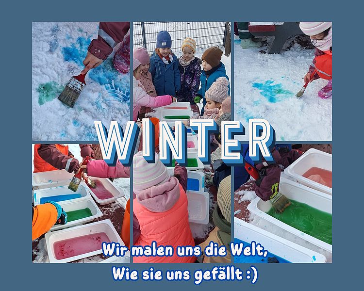 Pünktlich NACH Weihnachten fiel dann endlich der Schnee und die Kinder waren begeistert über die weiße Pracht. Zufällig hatten alle die gleiche Idee gehabt und den Tag mit spannenden Experimenten gestaltet. Die Wühlmäuse und Knallerbsen sind - mit Lebensmittelfarben bepackt - raus und haben die Farbe in Wasser gemischt, um die weiße Pracht zur bunten, kalten Kinderwelt zu gestalten. Da war dann das ein oder andere Krippenkind später ganz irritiert warum denn der Schnee plötzlich blau ist!