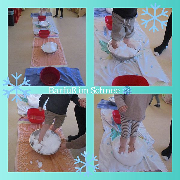 Das Schneetreten äußerst wirsam zur Stärkung der Abwährkräfte sein kann, ist nicht wirklich neu. Aber es ist auch ein Miniabenteuer für unsere jüngsten Kindergartenkinder. Die Kleinen Strolche kostete es am Anfang erstmal Überwindung mit den kleinen nackten Füßen in den kalten Schnee zu treten. Alle haben sich getraut und fühlten zuerst die Kälte. Und nach dem Abtrocknen wie die kleinen Füßchen richtig schön warm wurden. Das klingt nach einem spannenden kleinen Abenteuer. Mal sehen, ob sich die großen Kinder auch trauen werden.