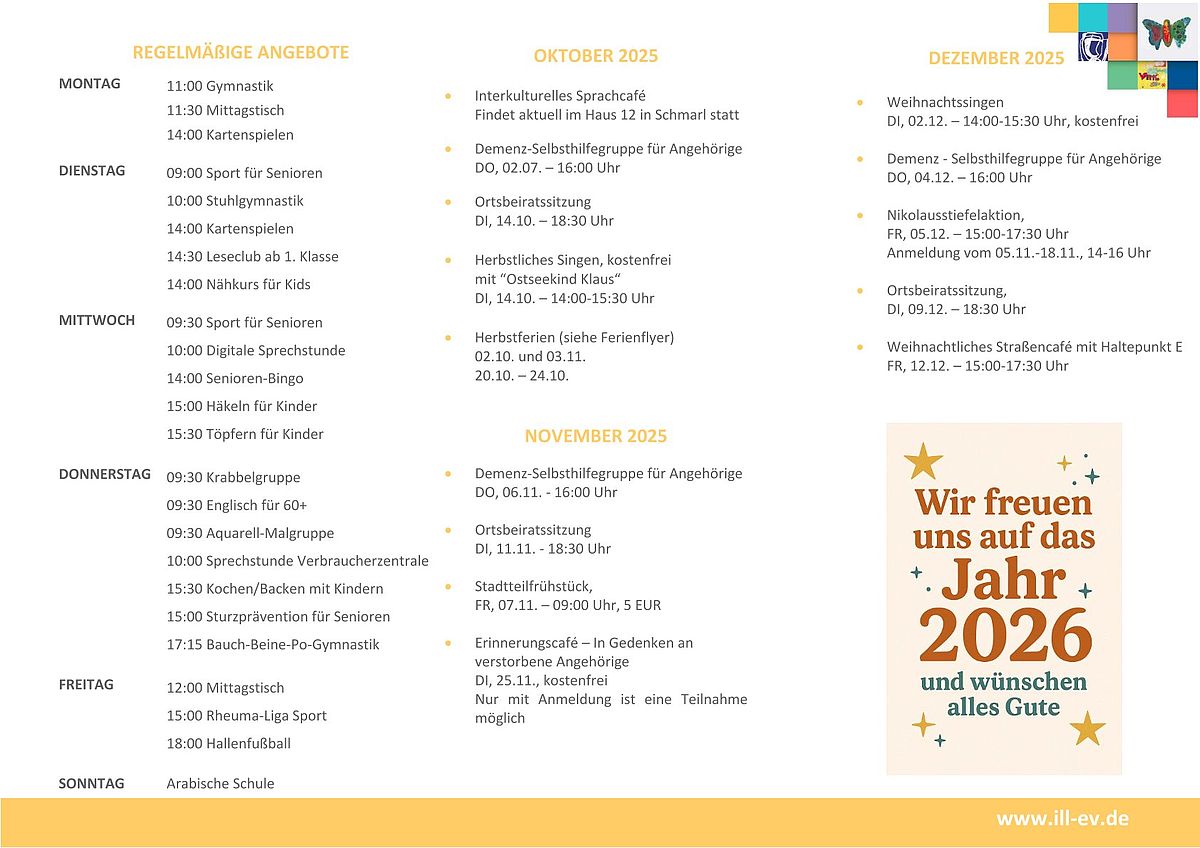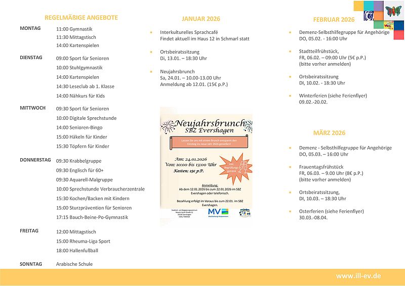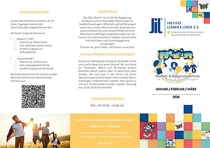 Jedes Quartal erscheint ein neuer Flyer der Sie über aktuelle Veranstaltungen und über regelmäßige Angebote des SBZ's informiert. Diesen finden Sie auch als gedruckte Variante oder als Aushang bei uns im Haus .