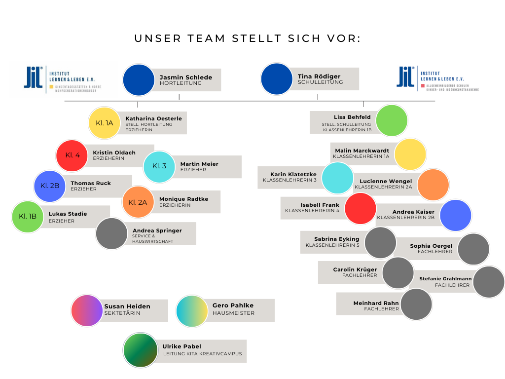 Wir sind ein bunt gemischtes Team aus engagierten Lehrkräften, kreativen Freizeitpädagog:innen, tatkräftiger Hauswirtschaft, unserem zuverlässigen Hausmeister und einer kompetenten Verwaltung. Gemeinsam gestalten wir den Schulalltag an unserer Grundschule mit Orientierungsstufe – voller Freude, Ideen und Tatendrang.