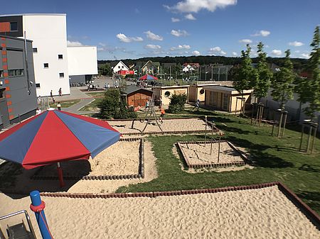 Im hinteren Bereich des Außengeländes befindet sich unser Spielplatz. Der große Sandkasten steht zum Graben und Burgen bauen bereit. Darüber hinaus lädt unser vielfältiges Klettergerüst jedes Kind zum Rutschen und Hangeln ein.