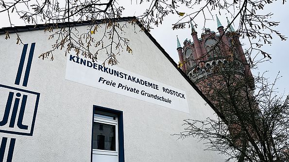 Von dem Schulgebäude am Wasserturm nutzt die "Kinderkunstakademie Rostock" den rechten Abschnitt sowie die Räumlichkeiten der unteren rechten Etage vom gesamten Bau.