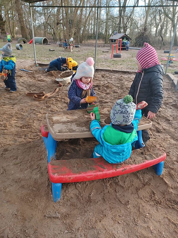 Die große Sandkiste lädt zum Forschen, Bauen und Kreativsein ein.