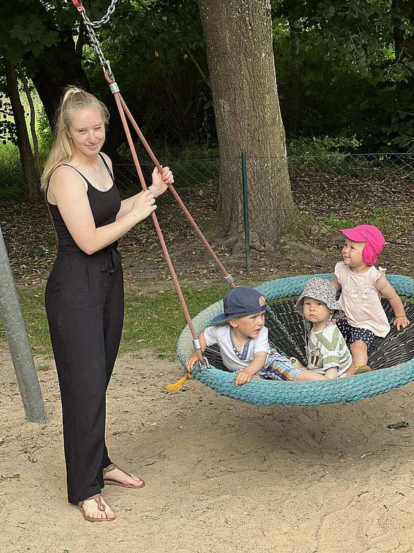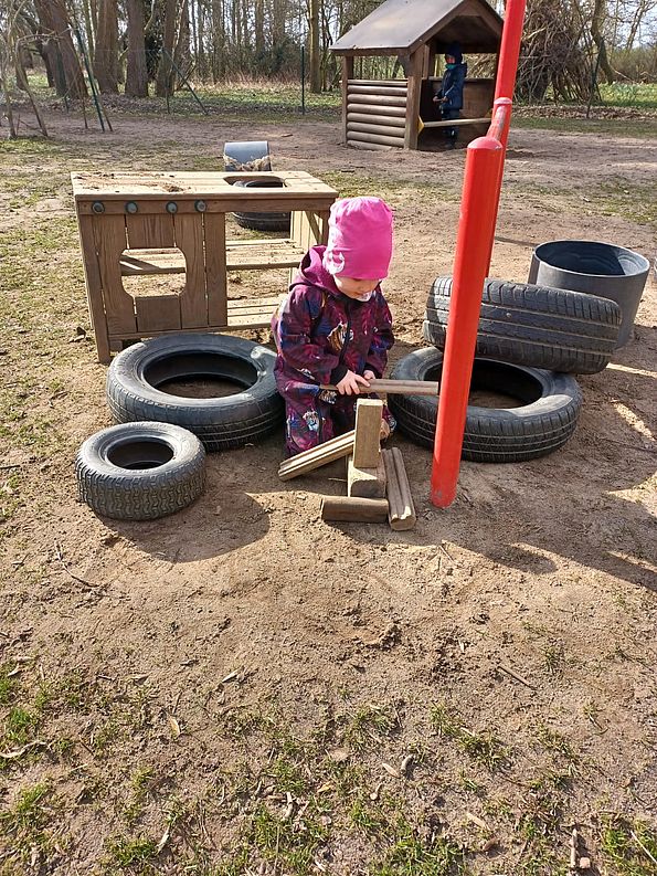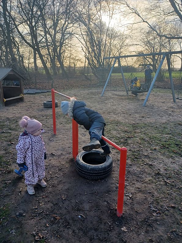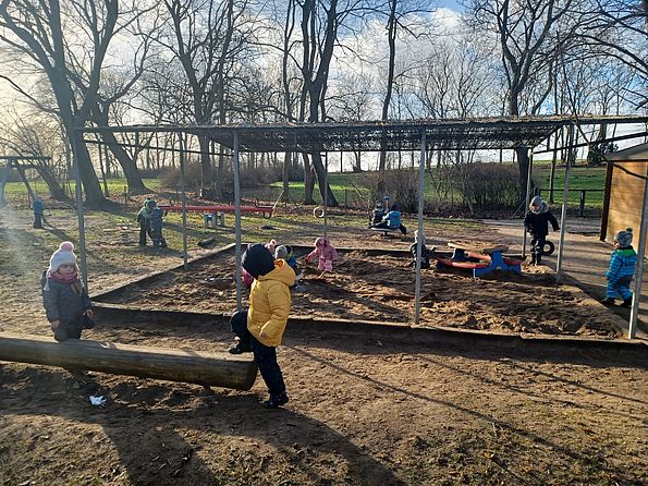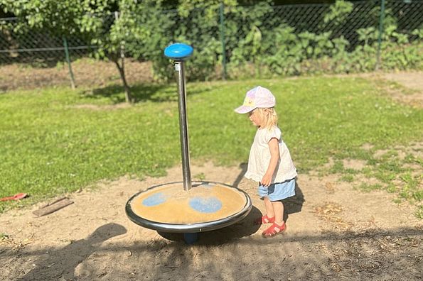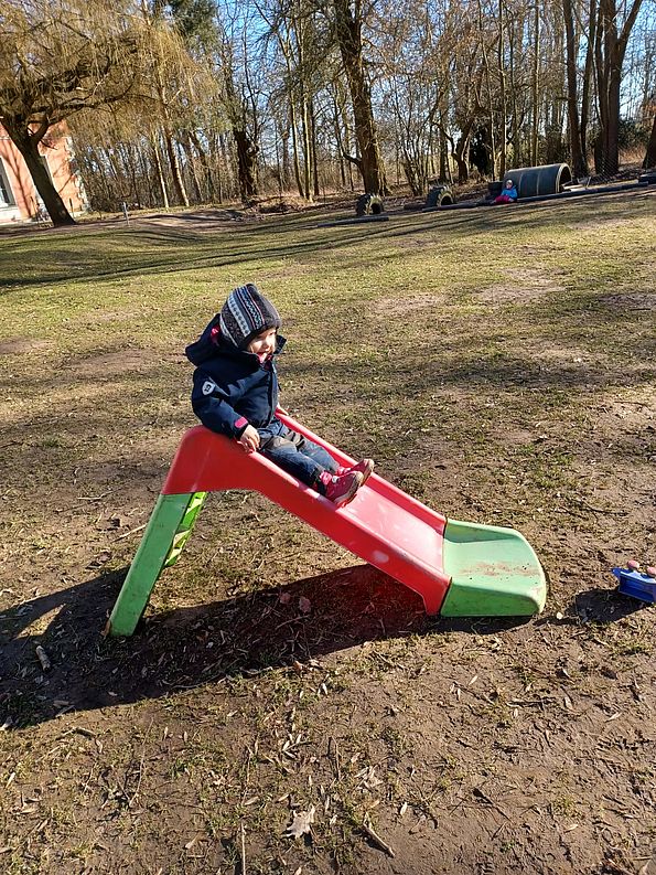 ...bietet jede Menge Platz für Bewegungen jeglicher Art. Ein gepflasterter Weg sorgt für eine Fahrzeugstrecke, sodass Dreiräder, Roller, Bobby-Cars und Tretautos genutzt werden können.
