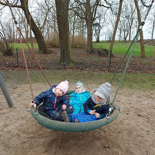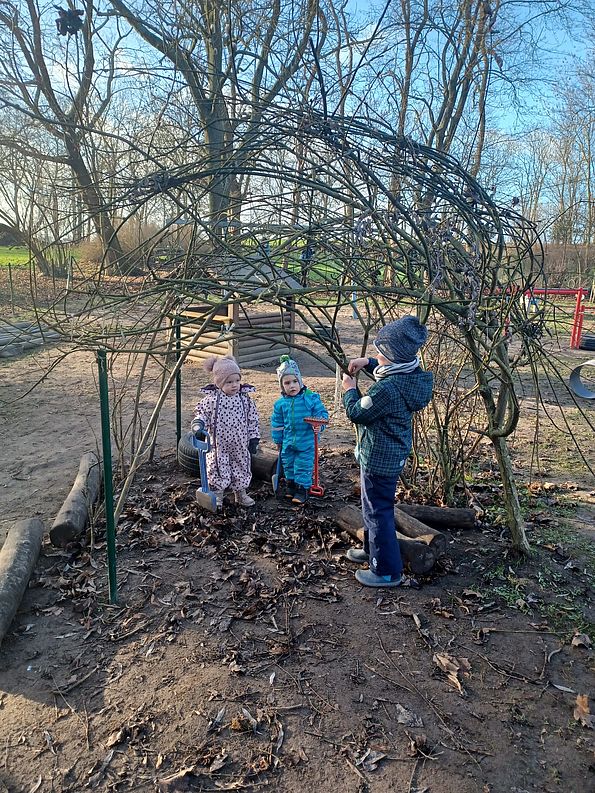 Weiterhin finden die Kinder vielfältige Versteckmöglichkeiten, so zum Beispiel einen großen Kriech- und einen Weidentunnel. Das Holzhaus und die zwei Schaukeln runden das Gesamtbild des Hofes ab.