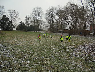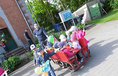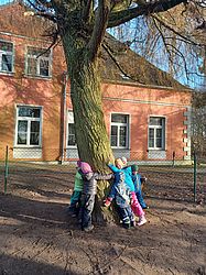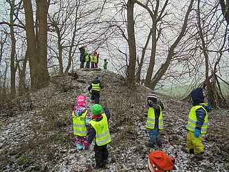 Das angeschlossene Außengelände und auch die dörflichen Gegebenheiten mit Feldern und Wiesen laden zum Entdecken und Forschen ein. Beobachtungsgänge durch das Dorf sowie auf Feld und Wiesen sind fester Bestandteil des Alltags geworden. Die Kinder sind viel ander frischen Luft und genießen dies in vollen Zügen. Wir freuen uns immer darauf die Gegend zu erforschen, dazu gehören unsere Spaziergänge auf den Feldern und Wiesen sowie auch ein gelegentlicher Besuch im Kuhstall, der nicht weit von unserer Kindertagesstätte liegt. Ebenfalls freuen wir uns täglich über die kleinen Dinge vor der Tür – Spinnen, Ameisen, Hühner, Vögel, Kühe, Blumen, Bäume, Gras, Sand, Erde, Wasser, Hügel, Findlinge, Baumstämme, Äste, all das befindet sich auf und an unserem Außengelände. Die Erzieher verstehen sich als Begleiter in dieser Zeit, denn die Kinder erkunden und entdecken mit allen Sinnen.