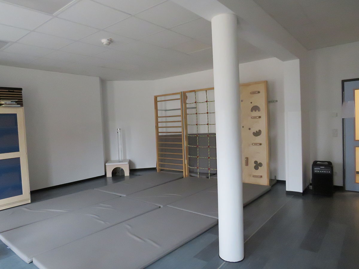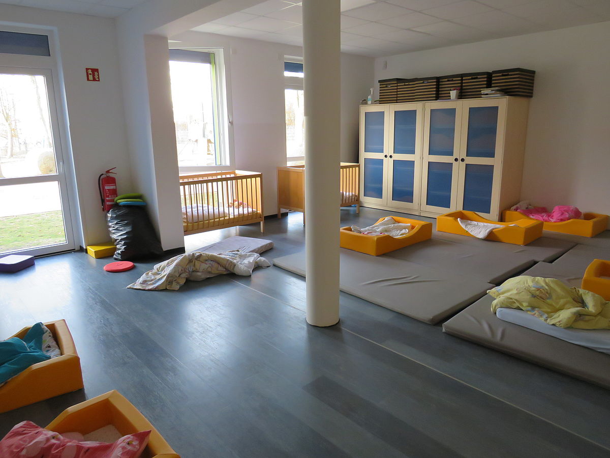 Ein großer Schlafraum für die Kindergartenkinder kann im laufenden Kitaalltag auch als Sinnes- und Bewegungsraum umfunktioniert werden. Zur Schlafenszeit finden die Kinder auf Matten ihre Ruhe. Elektrische Rollos ermöglichen es uns diesen Raum komplett zu verdunkeln.