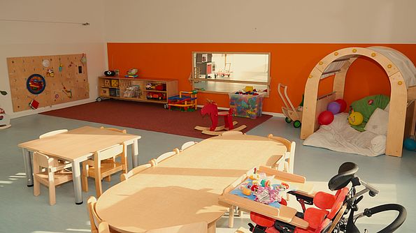 Die hellen und freundlichen Gruppenräume laden zum Bewegen, Bauen, Musizieren und vielen anderen Tätigkeiten ein. Große, bis auf den Boden reichende Fenster, lassen die Kinder so manch spannende Dinge (z.B. Wettererscheinungen, Fahrzeuge und andere Kinder) beobachten.